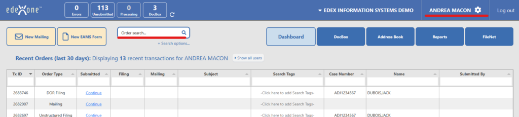 This new dashboard consolidates all recent orders, and provides an order search screen with simple options to find your previous activity. New quick alert icons display counts of your unsubmitted and in-process orders, filing errors, and new DocBox records.